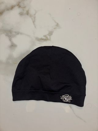 Cuffia nera con un logo distintivo sul bordo. - Logo ricamato in bianco. - Materiale morbido e confortevole.