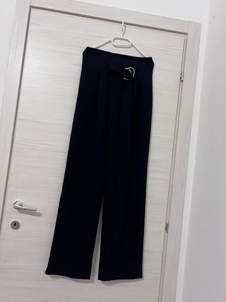 Pantaloni neri dal taglio elegante, perfetti per un look sofisticato. - Dettaglio cintura con fibbia dorata. - Tessuto fluido e leggero. - Vita alta.