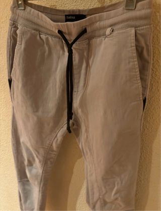 Pantaloni del marchio Bershka in tonalità beige/grigio/bianco. Hanno una cintura elastica e cordoncino. Taglia XS 34. Vestibilità slim. Ottimo stato ma nella parte posteriore c'è una lettera parzialmente cancellata (ultima foto).