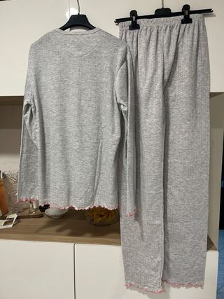 Comodo pigiama da donna in cotone caldo, ideale per le notti più fredde. - Maglia a maniche lunghe con scollo rotondo e bottoncini. - Pantaloni lunghi con elastico in vita. - Dettagli con volant e fiocco. - Fantasia a pois. - Felpato all’interno.