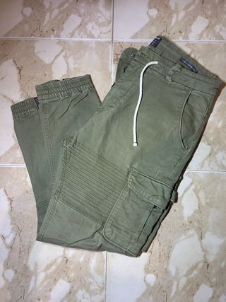 Pantaloni cargo da uomo in un bel color verde oliva. Sono comodi e alla moda. - Vita elasticizzata con coulisse. - Tasche cargo laterali. - Dettagli a coste sulle ginocchia. - Zip alle caviglie.