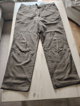 Pantaloni stile chino da uomo in un tono verde cachi. Sono comodi e versatili. - Taglio dritto. - Chiusura con bottone e cerniera. - Due tasche laterali. - Due tasche posteriori.