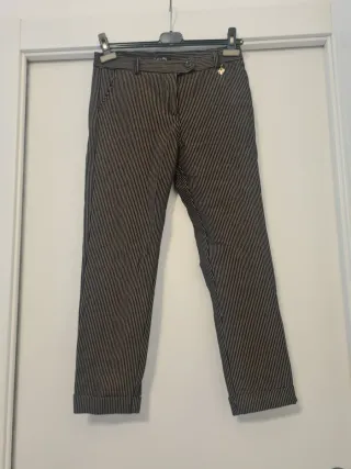 Pantaloni eleganti con un design moderno e raffinato. - Tessuto morbido e confortevole. - Dettaglio volant sulla vita. - Coulisse regolabile per una vestibilità personalizzata. - Linea morbida con gamba leggermente affusolata,che lo rende elegante. - Chiusura particolare con scatola a perno (vedi ultima foto). - 95% Poliestere , 5% Elastane. - Come nuovi lerche usati solo 3 volte - UNICO DIFETTO: si è scucito intorno alla chiusura del perno (vedi ultima foto!) - Lunghezza: 96 cm. - Vita: 74 cm. - Fianchi: 103 cm. - Spedizione veloce. - Imballaggio curato.