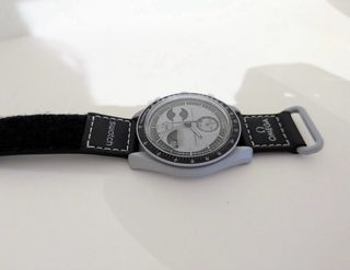 Orologio Omega x Swatch, modello Mission to the Moon. - Cassa in bioceramica. - Cinturino in velcro. - Quadrante nero con dettagli bianchi.