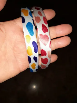 Due cerchietti per capelli con un allegro motivo a cuori. - Un cerchietto ha cuori multicolore su sfondo bianco. - L'altro cerchietto ha cuori rossi e rosa su sfondo bianco.