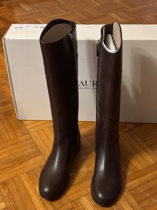 Stivali alti Brooke in vitello Circonferenza apertura del gambale: 37 cm. Punta arrotondata. Chiusura laterale con cerniera. Cinturino con fibbia e passante "LRL" con finitura ottone alla caviglia. Soletta imbottita. Tacco striato in cuoio. Suola in gomma. Tomaia: pelle. Fodera: pelle, cotone, poliuretano. Assicurarsi di asciugare immediatamente le gocce sulla pelle. Per le macchie più difficili da eliminare, si consiglia un lavaggio professionale specifico per la pelle. Una scarpa ha un piccolo graffio. TG :37,5 Prodotto nuovo e originale.