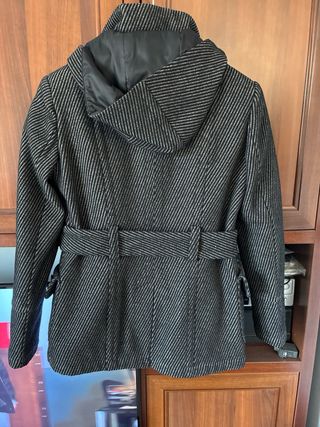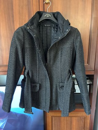 Elegante giacca con un motivo a righe sottili. Controllare le misure Spalla 42 cm Ascelle 50 cm Lunghezza 66 cm - Chiusura con zip. - Cintura in vita con fibbia. - Tasche frontali con patta e bottone. - Collo alto.