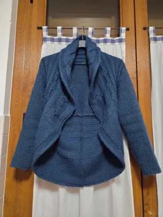 Cardigan Zuiki dal colore blu petrolio, perfetto per completare ogni outfit. - Lavorazione a trecce sulle maniche e sul davanti. - Scollo a scialle. - Orlo asimmetrico. - Tessuto morbido e caldo.