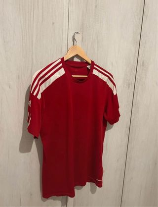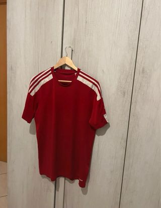 Maglietta sportiva Adidas dal colore rosso vivace, perfetta per l'allenamento o il tempo libero. Presenta le iconiche strisce bianche sulle spalle e sulle maniche. - Design sportivo - Tessuto traspirante