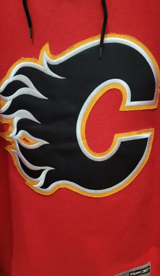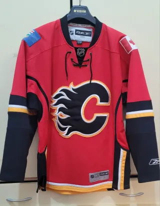 Maglia da hockey Reebok dei Calgary Flames. - Logo C con fiamme sul petto. - Patch NHL e Reebok. - Patch bandiera canadese e Alberta sulle spalle.
