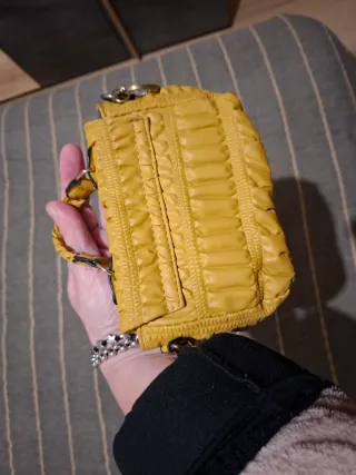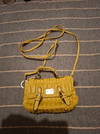 Borsa porta cellulare di colore senape, nuova. - Dettagli con fibbie e chiusura a scatto. - Manico intrecciato e tracolla regolabile. - Elementi metallici dorati