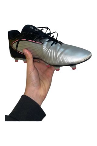 Scarpe da calcio Puma con un design moderno. - Tomaia in argento metallizzato con dettagli neri. - Lacci neri. - Suola con tacchetti rosa.