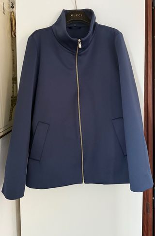 Giubbotto EMME by Marella blu: E' in tessuto scuba. E' di taglio svasato, con due tasche sul davanti. Si chiude con una lunga cerniera centrale. Taglia: L (ho rimosso il cartellino interno) Misure: spalle 42 cm. larghezza al seno 55 cm. larghezza vita 57 cm. lunghezza 69 cm. maniche 64 cm. Il giubbotto e' in buone condizioni: presenta un difetto su un fianco (visibile in foto).