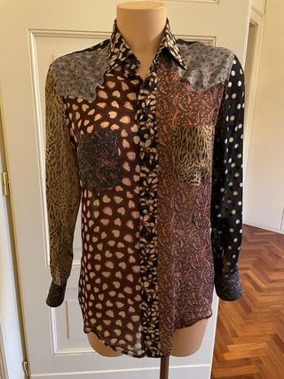 Camicia Saint Laurent con un design patchwork unico. - Tessuto leggero e trasparente. - Fantasie miste: animalier, pois, cuori e paisley. - Colletto classico e chiusura con bottoni.