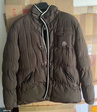 Elegante piumino Moncler in una calda tonalità marrone. Un capo versatile e di alta qualità. - Logo Moncler applicato sulla tasca. - Chiusura frontale con bottoni a pressione. - Tasche laterali con zip. - Collo alto con dettagli a contrasto.