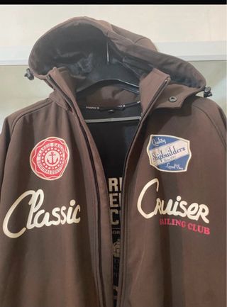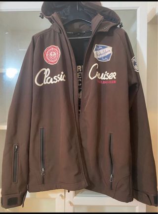 Giacca marrone con cappuccio e dettagli a tema nautico. - Patch Classic con ancora rossa. - Patch Cruiser Sailing Club con scudo blu. - Zip frontale e tasche laterali con zip. - Dettagli con zip sulle maniche.