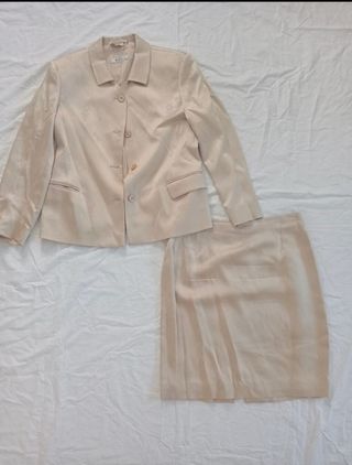 Elegante completo composto da giacca e gonna. Giacca con chiusura a bottoni. Tasche frontali applicate sulla giacca. Tessuto satinato. Misure in foto. Ottime condizioni