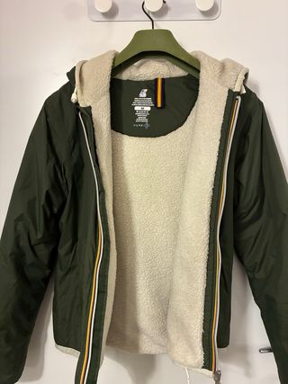 Giubbotto K-Way con fodera interna in pile, perfetto per le giornate più fredde. - Cappuccio con coulisse. - Zip frontale con dettagli colorati. - Tasche laterali. - Coulisse sul fondo.
