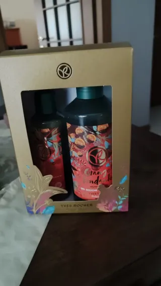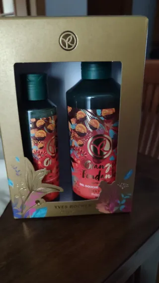 Bellissimo set regalo Yves Rocher. - Confezione dorata con decorazioni floreali. - Include due flaconi con etichette colorate.