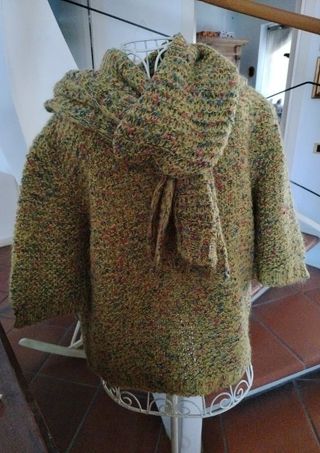 Bellissimo maglione da donna,marca Benetton,lana pregiata(non si allega l'etichetta dell'esatta composizione in quanto assente..a suo tempo tagliata),con sciarpa coordinata,maniche bon ton(a tre quarti)taglia 42,misure maglia:spalle 40 cm,lunghezza 48 cm,misure sciarpa::110x21 cm.In perfette condizioni(potrei dire nuovo). Prezzo fisso! - Design melange con fili colorati.
