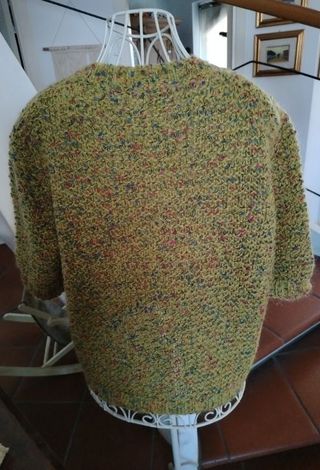 Maglione a mantella, chiusura incrociata. Lunghezza 48 cm, maniche 60 cm, spalle 41 cm, ascelle 54 cm. Taglia 40 europea, misure in cm nelle foto.