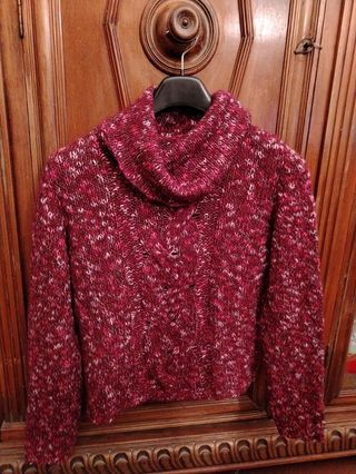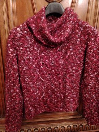 Maglione da donna,lana-acrilico(non si allega l'etichetta dell'esatta composizione in quanto assente..a suo tempo tagliata),melange su base fucsia-bordeaux,misure:spalle 41 cm,lunghezza 53 cm,in ottime condizioni. Prezzo fisso