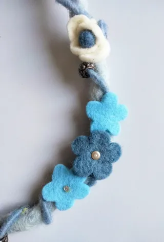 Collana fatta a mano con cura, perfetta per aggiungere un tocco unico al tuo stile. Realizzata in feltro e lana cotta, molto leggera. - Decorata con graziosi fiori. - Comoda chiusura a moschettone.