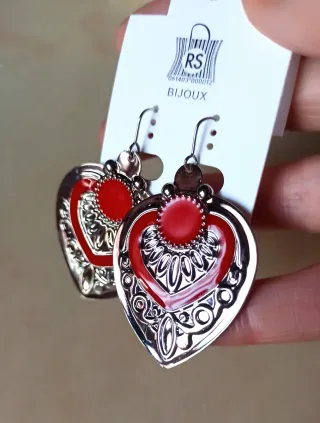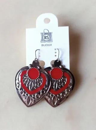 Orecchini pendenti color argento, design a cuore e laccatura rossa, con motivi ornamentali in rilievo. Lunghezza totale 5.5 cm. ⚠️Prezzo non trattabile.