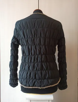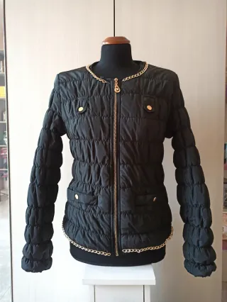 Giubbotto imbottito nero da donna, con dettagli a catena color oro. Taglio corto e slim, è segnato come taglia L ma veste meglio una S o M, comunque l'arricciatura è elastica. ➡️Vedi misure in ultima foto. ⚠️Prezzo non trattabile.