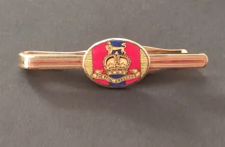 Elegante fermacravatta con il distintivo reggimentale dei " The Royal Dragoons " ( 1° Dragoni Reali ) , un ex reggimento di cavalleria dell' esercito britannico . L' emblema presenta lo stemma reale del leone e della corona . Il reggimento di cavalleria di linea più antico nella storia dell' esercito britannico fondato nel 1661 . L' oggetto è in metallo dorato con un inserto smaltato raffigurante il distintivo