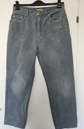 Stefanel Jeans denim uomo vintage grigio, vita alta tg. L 50IT. In ottime condizioni, presenta lievi segni del tempo, alle ginocchia e sull'orlo al fondo delle gambe, che conferiscono fascino e appeal a un capo di oltre 30 anni fa. Manca cartiglio posteriore. Misure in cm: vita 39 girovita 84 cavallo davanti 31 cavallo dietro 41 coscia max 33 gamba esterna 102 gamba interna 71 fondo 20.