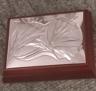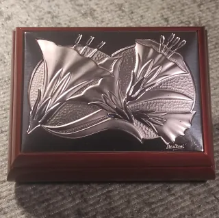 Portagioie Ottaviani , azienda italiana che opera dal 1945 riconosciuta per il suo stile e la sua maestria artigianale . Realizzato in legno di noce lucido con un inserto in laminato d'argento sul coperchio che raffigura una scultura decorativa con un motivo floreale e foglie in rilievo . Marchio Ottaviani ed etichetta " Opera Depositata " che indica e verifica che il design e l'opera sono registrati e protetti . Interno in tessuto beige pulito e senza macchie, esterno perfetto tranne uno spigolo con un ritocco come si evince dalla foto . Misure cm 15×11,50 , altezza cm 4,50