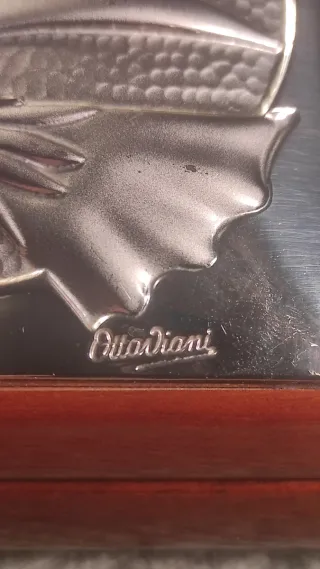 Cofanetto Portagioie Ottaviani , azienda italiana che opera dal 1945 , riconosciuta per il suo stile e la sua maestria artigianale . L'oggetto presenta un design elegante, realizzato in legno di noce lucido, con un inserto in lamina d'argento sul coperchio che raffigura una scultura decorativa con un motivo floreale e foglie in rilievo . Marchio Ottaviani ed etichetta " Opera Depositata " che indica e certifica che il design e l'opera sono registrati e protetti . Interno in tessuto beige, pulito e senza macchie , esterno perfetto tranne uno spigolo con un piccolo ritocco come si evince dalla foto. Misure cm 15×11,50 , h cm 4,50