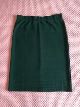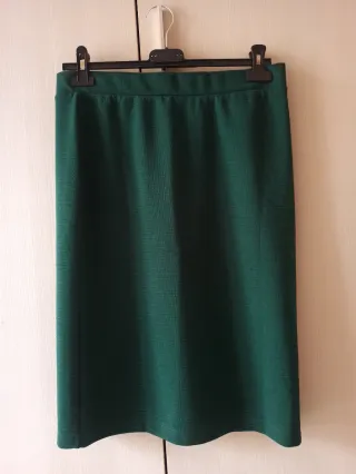 Gonna a tubino verde scuro Esmara, lunghezza sotto al ginocchio. Segnata come taglia M 42/44, è più adatta a una L italiana perché veste grande. Misura vita: 39 cm; lunghezza: 62 cm.