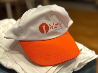 Cappello berretto con visiera del brand 1 Mobile. - Colore bianco e arancione. - Logo 1 Mobile sul davanti.