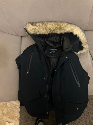 Giubbotto invernale con cappuccio bordato in pelliccia sintetica. - Chiusura centrale con zip e bottoni. - Tasche frontali con patta. - Tasche laterali con zip. - Polsini regolabili.