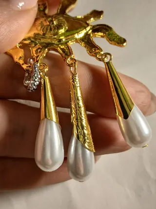 Spilla a forma di occhio con dettagli pendenti. - Design unico a forma di occhio. - Finitura color oro. - Decorata con perle e cristalli. - Elementi pendenti a catena.