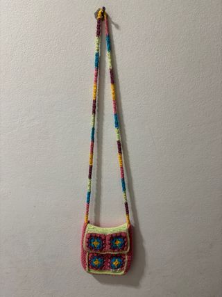 Borsa a tracolla realizzata all'uncinetto con un design colorato e vivace. - Tracolla lunga e multicolore. - Motivo a quadrati all'uncinetto. - Chiusura con patta.