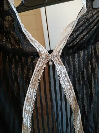 Delicata lingerie in tessuto trasparente con righe verticali e dettagli in pizzo. - Inserti in pizzo bianco e beige. - Perla decorativa centrale.