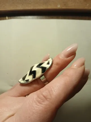 Anello con un design a zigzag audace e moderno. - Motivo a zigzag in bianco e nero. - Bordo esterno in smalto bianco. - Misura regolabile per una vestibilità comoda.