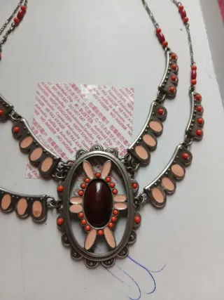 Collana con un design unico e dettagli curati. - Pietra centrale ovale color marrone scuro. - Dettagli in smalto color pesca. - Perline color corallo. - Catena a doppio filo.