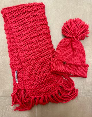 Sciarpa e berretto con pon pon coordinati marca take two Colore fucsia In trama a maglia grossa, morbidissima e lunga. Indossato poche volte!