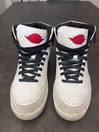 Scarpe alte Jordan in ottime condizioni, un classico intramontabile. - Design iconico con inserti rossi. - Tomaia in pelle bianca e tessuto tecnico. - Lacci neri a contrasto.
