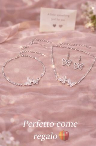 Elegante set di gioielli composto da collana e orecchini a forma di farfalla. - Design scintillante con pietre. - Finitura in argento lucido. #gioiellidonna #setgioielli #farfalla #collanafarfalla #orecchinifarfalla #braccialedonna #elegante #regalodonna