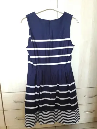 Splendido abito a righe blu navy e bianche, dallo stile marinaro elegante e perfetto per l'estate. Modello senza maniche, con zip posteriore e gonna leggermente svasata per una vestibilità comoda e femminile. 🔹 Taglia: M 🔹 Condizioni: Ottime, con una piccola e leggera stinta sul retro (vedi foto) ✨ Un capo versatile per un look fresco e alla moda! ✨ 📦 Acquisto entro le 17? Spedizione in giornata! 💌 Per info, scrivimi in chat! 😊