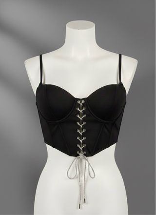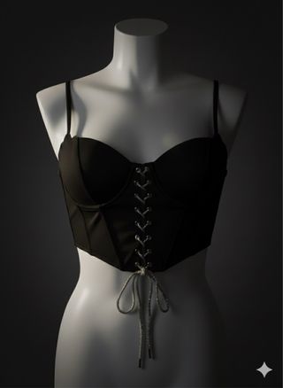 Elegante corsetto nero con un dettaglio di laccetti scintillanti che aggiungono un tocco di glamour. Perfetto per completare un outfit audace. - Design a corsetto. - Dettaglio laccetti frontali con glitter. - Spalline sottili regolabili.