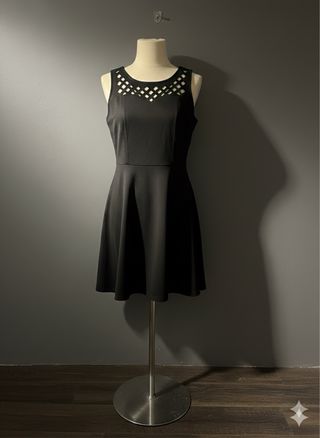 Elegante mini abito nero con un dettaglio a fiocco. Perfetto per occasioni speciali. - Scollo con motivo a rete. - Vita segnata. - Gonna svasata.