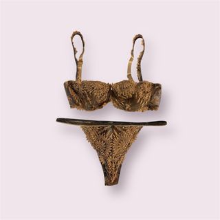 Elegante completo intimo Chantelle con dettagli in pizzo. - Colore: marrone e oro. - Taglia reggiseno: 75B. - Taglia slip: 75B.
