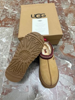 Ciabatte UGG in camoscio beige, perfette per stare in casa con stile. - Fodera interna in lana. - Dettaglio bordatura decorativa. - Logo UGG sul lato. Nuove mai indossate taglia 38 con scatola