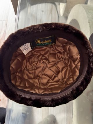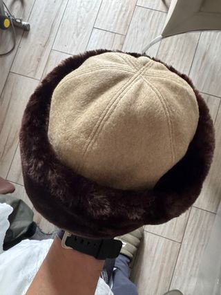Cappello di notevole qualità, ideale per proteggersi dal freddo. - Materiale esterno in tessuto beige. - Bordo in pelliccia sintetica marrone scuro.